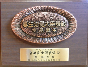 | [平成18度 厚生労働大臣表彰受賞] 厚生労働大臣食品衛生優良施設表彰を受賞しました。表彰式は前回受賞した日本食品衛生協会の時と同じ 東京の明治座でした。簡単には頂けない賞なので、かえって気を遣いますね。食品衛生に関して益々気を付 けなければ、と思います。(10/27) [昔の営業許可証] 以前から古い木札の許可証があるのは知っていたのですが、多分保健所から貰った物だと思っていました。 しかし、良く見ると警察のものでした。探してみるともう1枚あったので見てみると、これが保健所のものでし た。いずれも古いもので、本来返却しなければならないかも知れないのですが、聞いたところ既に現行の法 律から外れているので返却しなくてもいいとの事でした。まぁ、こちらとしても記念において置きたいですし、 返したくないのでやれやれです。 左側が警察署のもので「西脇警察署」と書いた下に焼印が押してあります。実は、この木札は更に古い時代 に発行されたものなのです。木札の裏側を見ると同じく「料理屋営業」の文字と共に警察の焼印があるので すが、「西脇町警察署」となっています。つまり、西脇が市制になる以前に発行されたものであることが分かり ます。残念ながら鉋で削って、文字が薄く残っているだけなので、写真には撮っていません。 右側が保健所のもので「昭和廿二年五月二日」発行のもので、私の祖母「宇野あき」の名前が書かれていま す。中央の一番下に「西脇保健所」の焼印が押してあります。 木札は、どちらももっと黒っぽいのですが、文字が読みにくいので、写真を明るく加工しています。(12/29) |